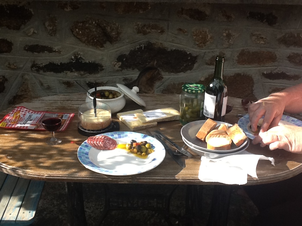 Our dear friend has nagged Rich and I about not eating lunch, so much so she started to feed us, bless her. But she has got us into simple French food and more often than not we have, cheeses, saucissons(dried sausage), bread, and more than anything olives.