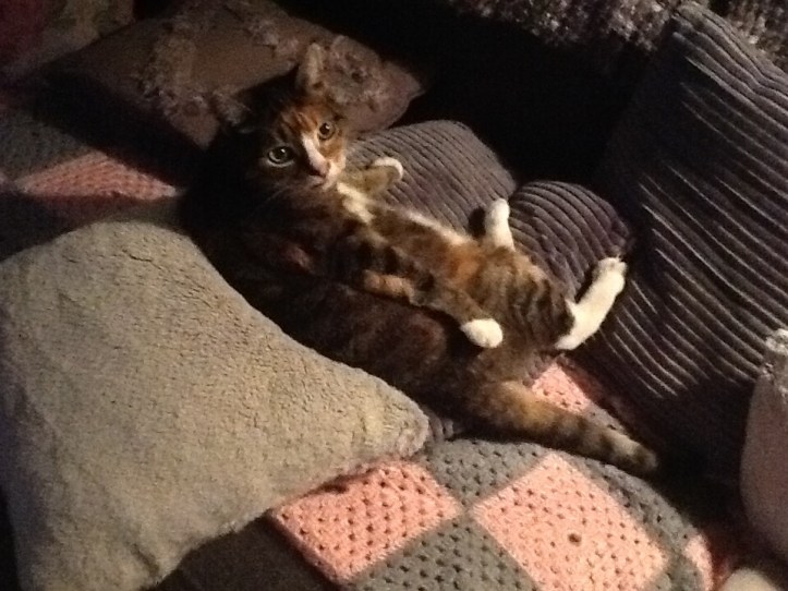 Saturday: Check, check check, check!! Oh hold on, we appear to have something under the log burner because diddymandod the cat (don’t ask she is female!!) is peering underneath it as if to say come out little thing I won’t hurt you. She then gets bored and the murderess starts. We are in bed having tea but can hear her banging and crashing around, knocking over the coal bucket, all of the fireside tools, and barking as if that will make it come out!! Harley is bored he has come back to bed with us.