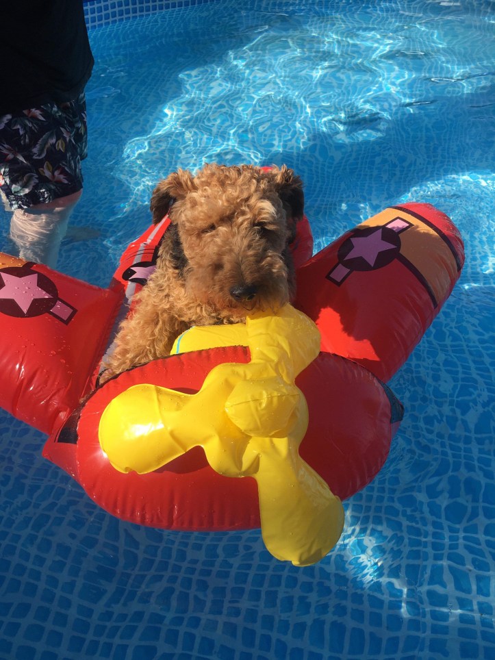 and the puppies have been swimming… in fact we have bought them an inflatable aeroplane and they have had fun sitting on that with Rich pulling them around the pool