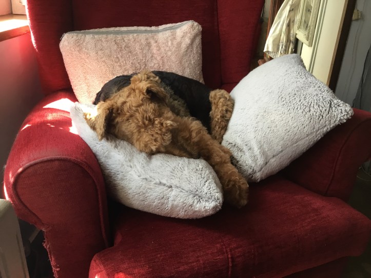 For the last two days Wiglet would not leave my side, in fact I knew I was in a bad place when she growled at Harley because she knew I was weak and took to guarding and protecting me. I made it to the chair yesterday morning, she ousted Danny and sat in the chair opposite me, just like a Welshie version of ‘Nanny’ from Peter Pan. When she finally left me to go into the garden, I took that as a positive sign.