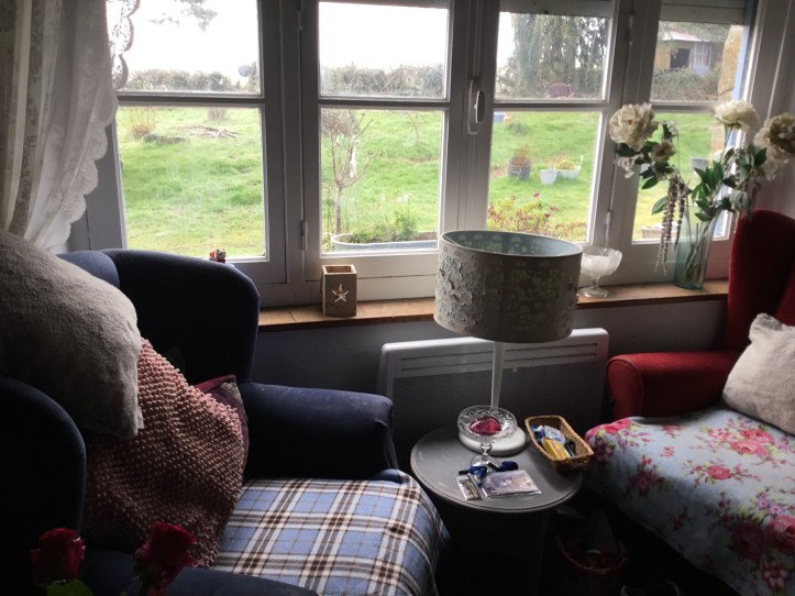It is a place I sit often to write, manage our life, and just look at life; and this table holds many things I use: my journal, my diary, my iPad, my book, books I am reading, currently Mark Nepo ‘The Book of Awakenings’, and ‘The Road Less Travelled and Beyond’. It has become a little sanctuary to me, as I look out on my garden, often with a Welshie sitting opposite me.