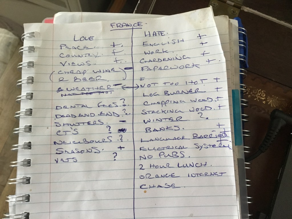 The next day I sat us in the morning sunshine with a cup of tea and two pads and pens. On each pad I had made two columns which I had headed ‘Love’ and ‘Hate’.