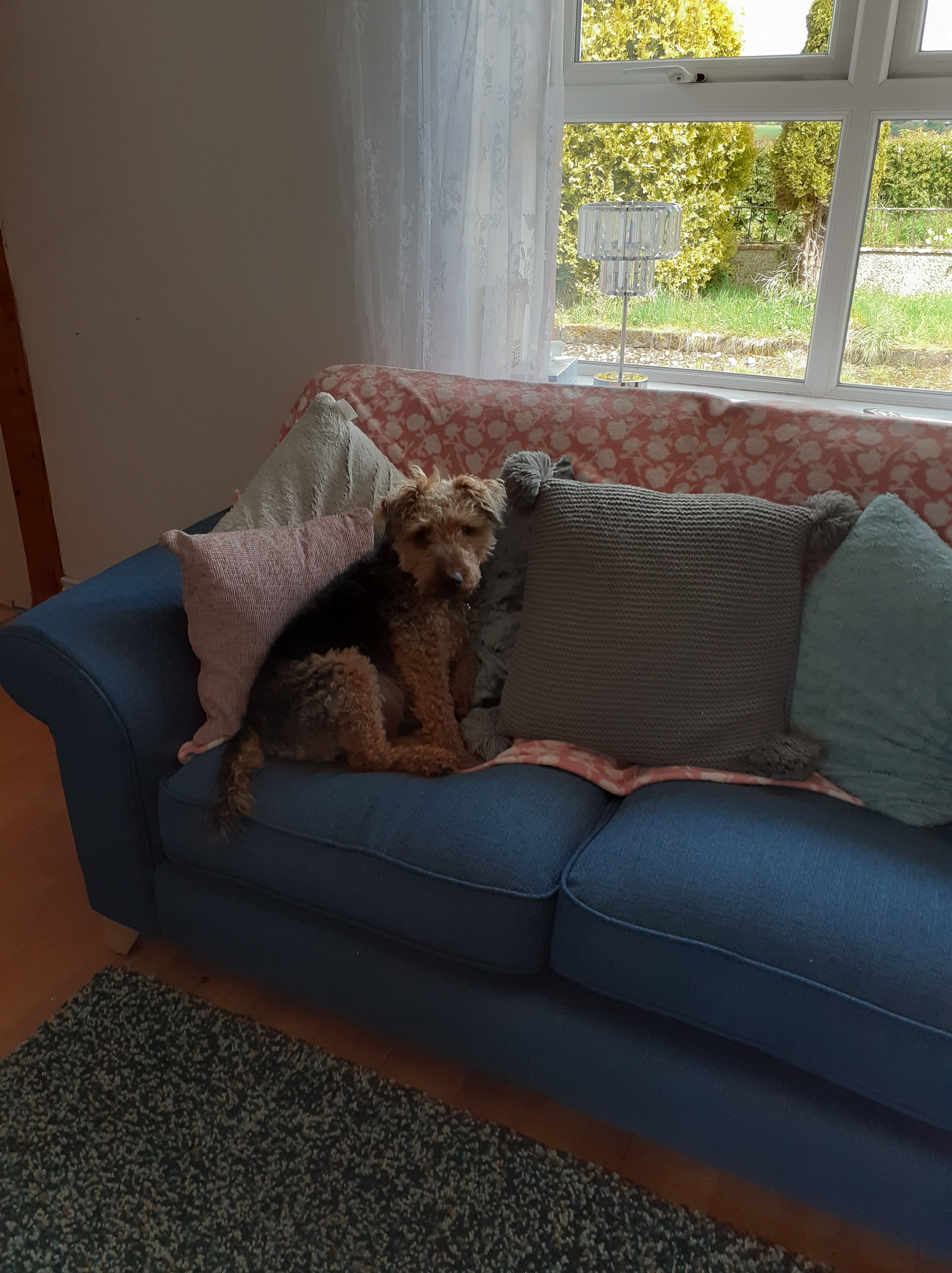 The sofa’s duly arrived this afternoon, and all our cushions were placed, and then redesigned by Wiglet!