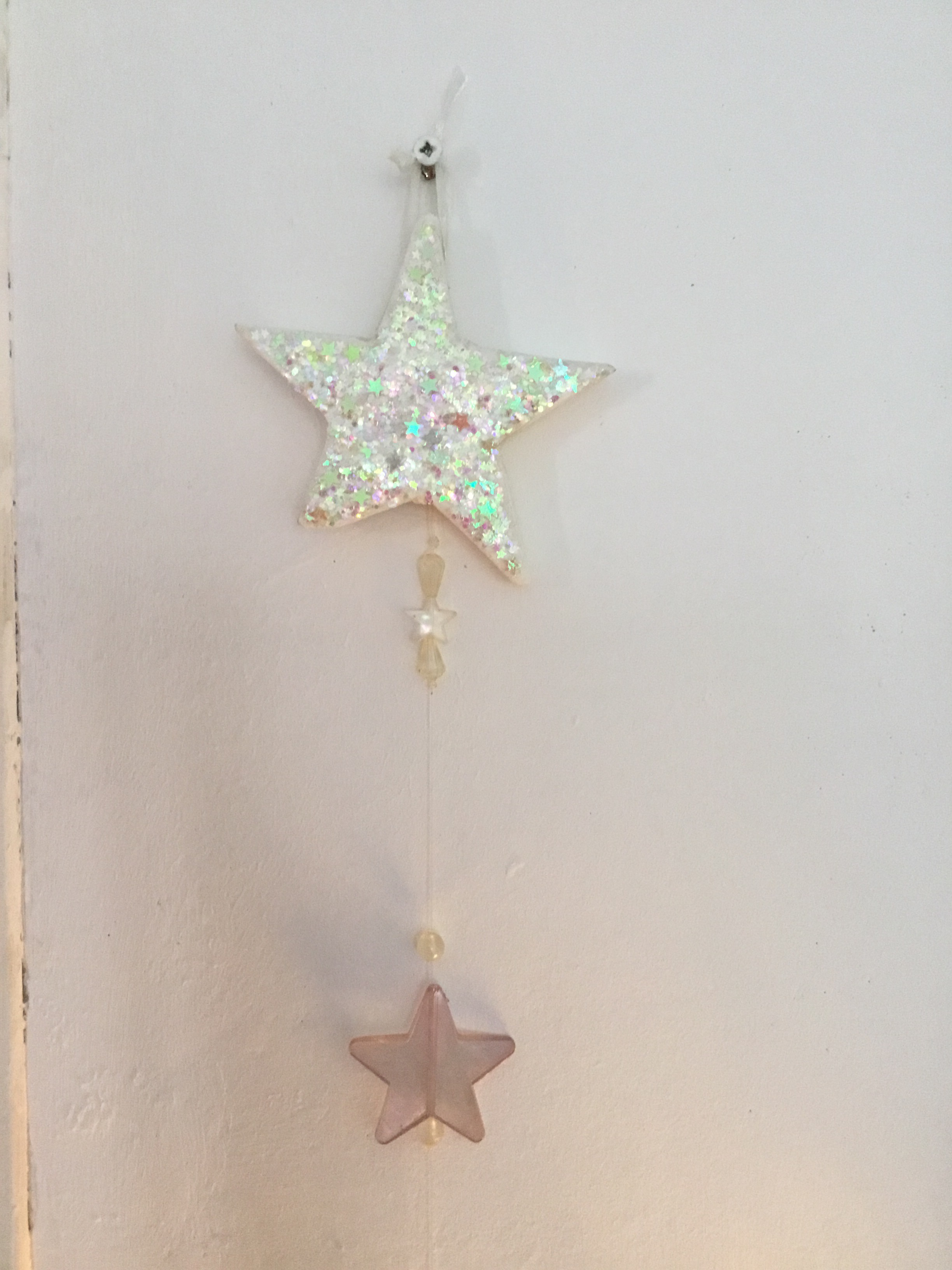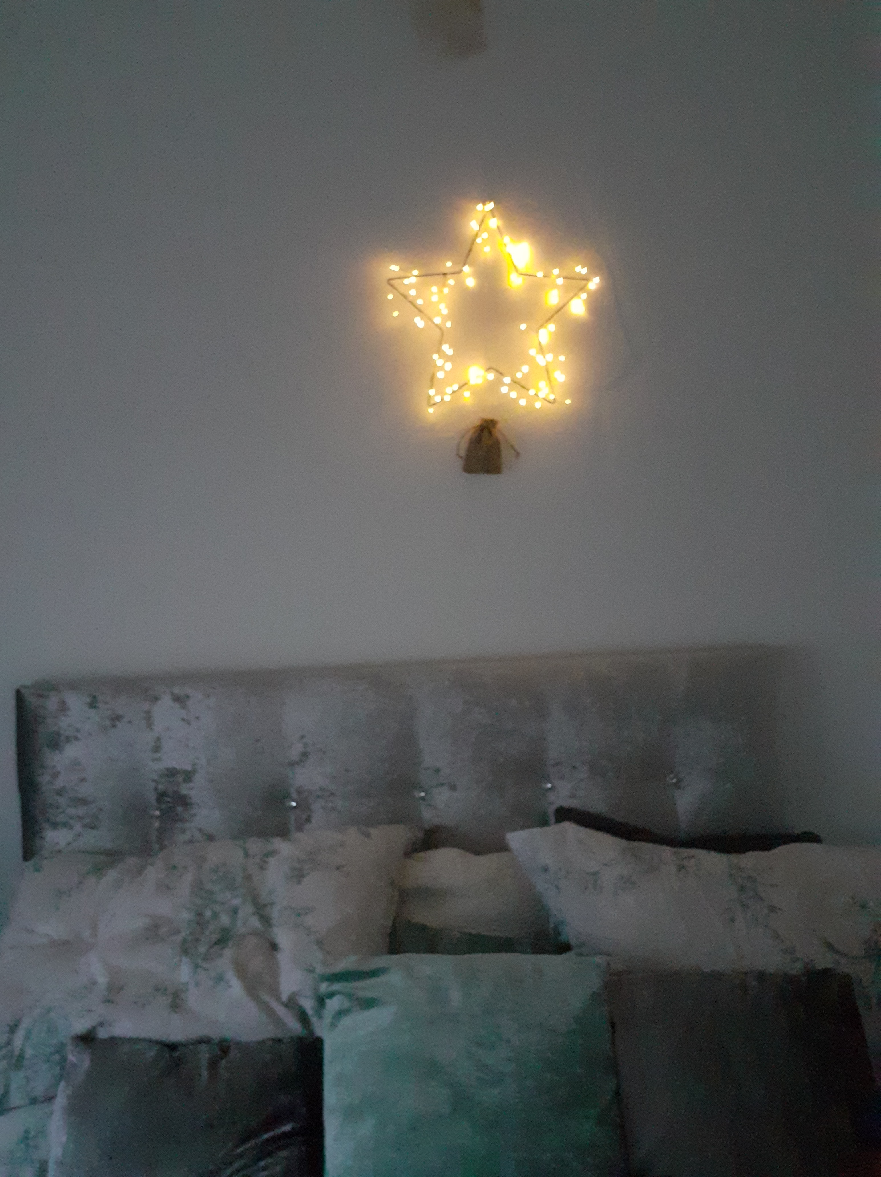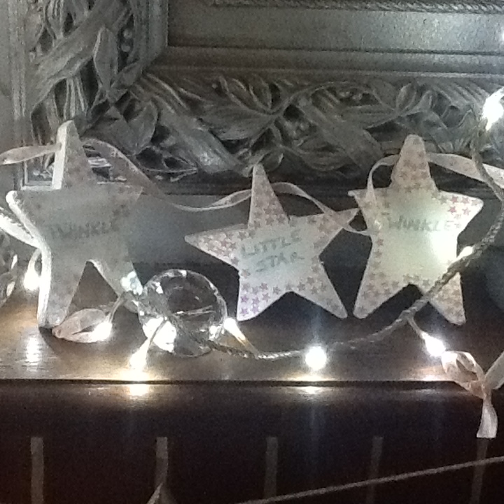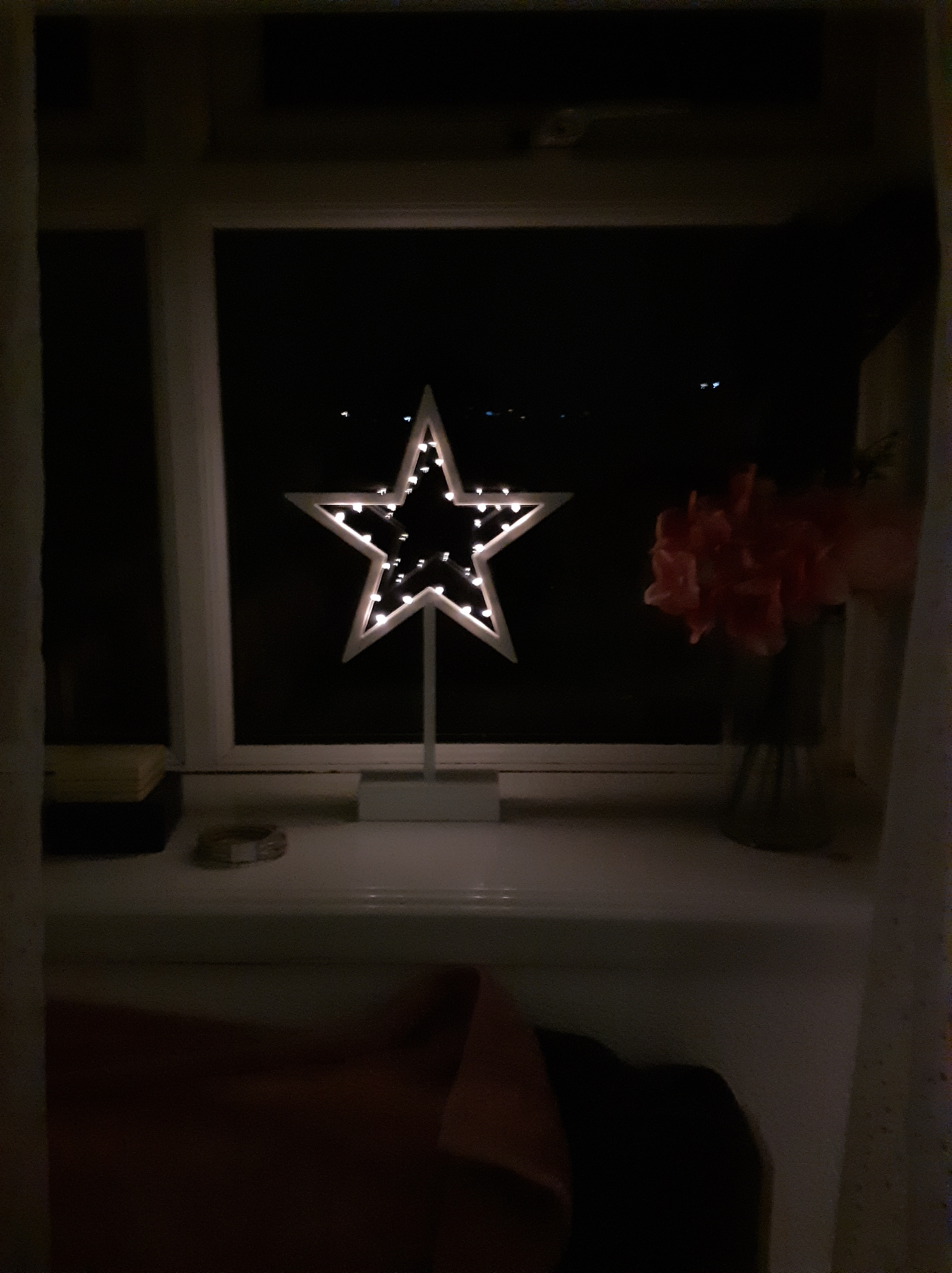 I miss our stars, I miss our stuff, still sadly in France. So we have bought some sparkly stars to put in our windows, all from discount stores, and very cheap; it’s hard to pick my favourite from this carved wooden star, to our little illuminated star in our bedroom window.