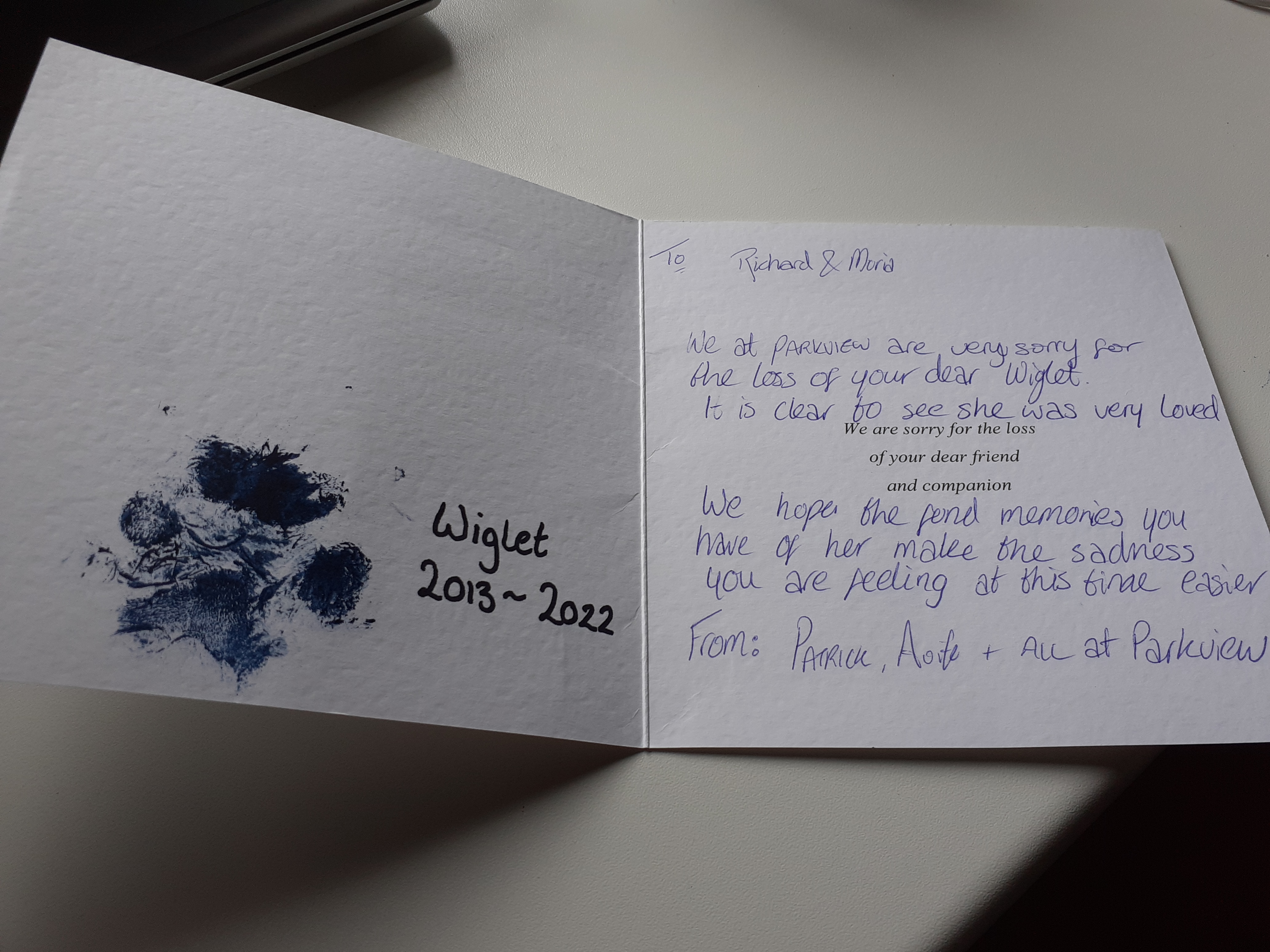 So yesterday morning after RD left for work, I put my coping mechanisms in place. I listened to ‘Fields of Gold’ by Eva Cassidy and to a tune that I played every morning in the ten days leading up to her death, ‘Merry Christmas Mr Lawrence; by Ryuichi Sakamoto. It is a beautiful, soulful piece of music that Wiglet loved as she grew more frail. They were my crying songs, and that was the time I had allowed myself. I was okay, until the post arrived. In it was a beautiful card from the veterinary team that helped us care for Wiglet and keep her with us for the last eleven months. In the card they had hand written how sorry they were for the loss of Wiglet and how clear it was that she had been very loved. They had included some of her fur and a little card with her fur in it.