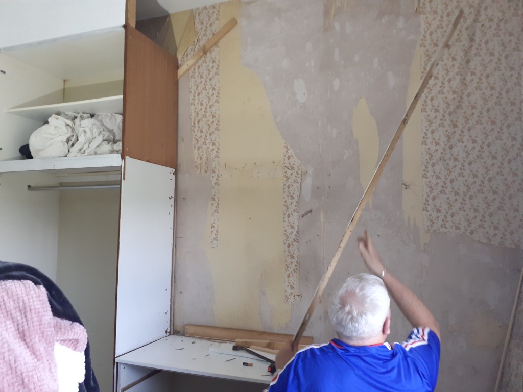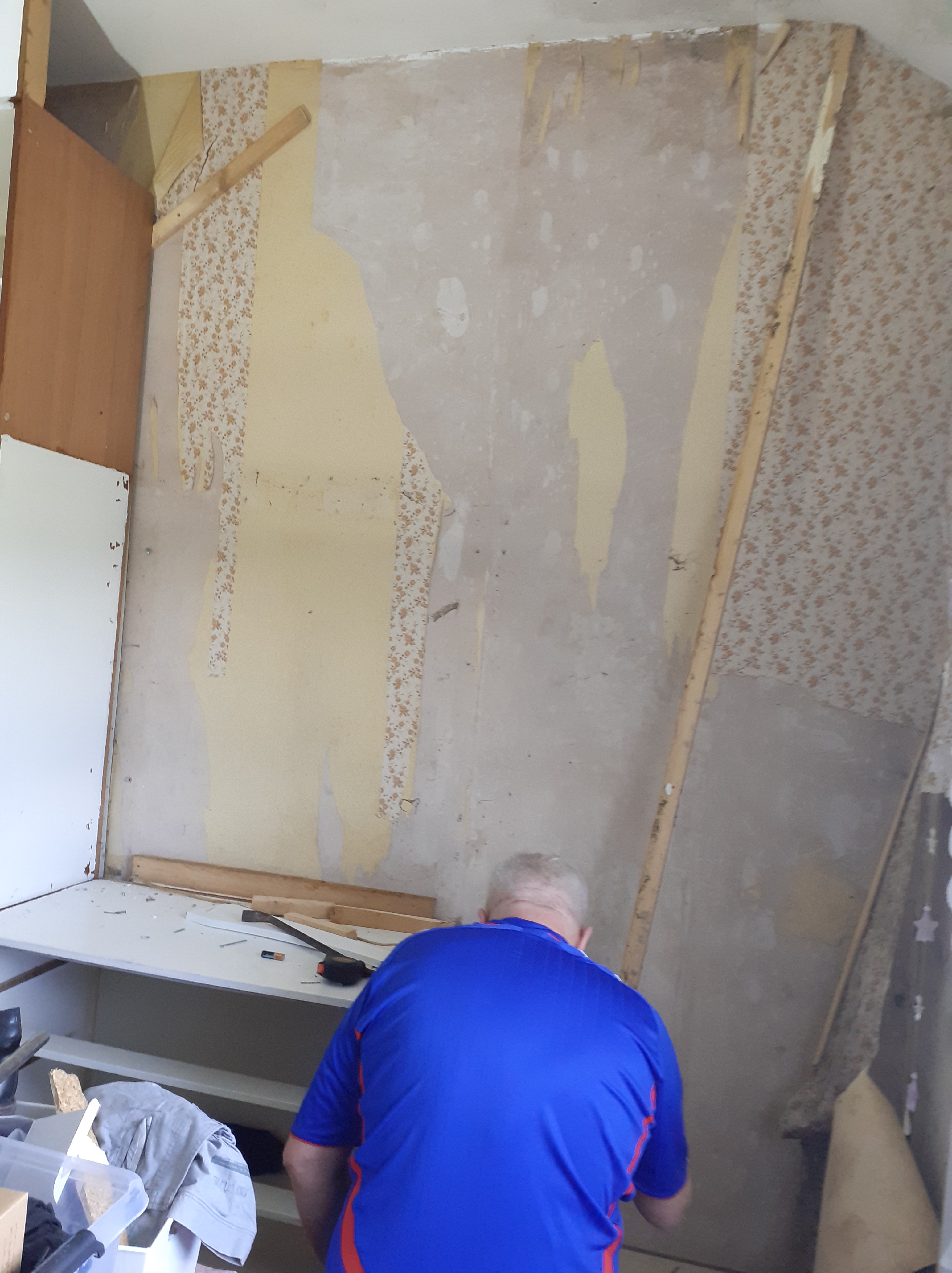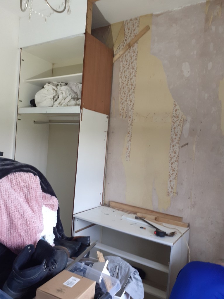 To add to the joy they had mainly been nailed in! According to our neighbours they have been in situ for well over fourty years, so in fairness they didn’t have the tools available to them as we do now . I assisted RD by slowly (with my sacroiliac injury) carrying the boards out into the garden. But it was the mess! We have a small house, taking ALL of our stuff out of the wardrobes meant it was everywhere.