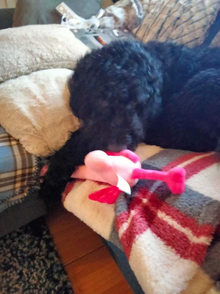 Poor Flamingo then had his head and neck pulled of and she was merrily pulling the stuffing out of him when along came mummy again and shoved him in the cupboard to be ‘sewn up later.’