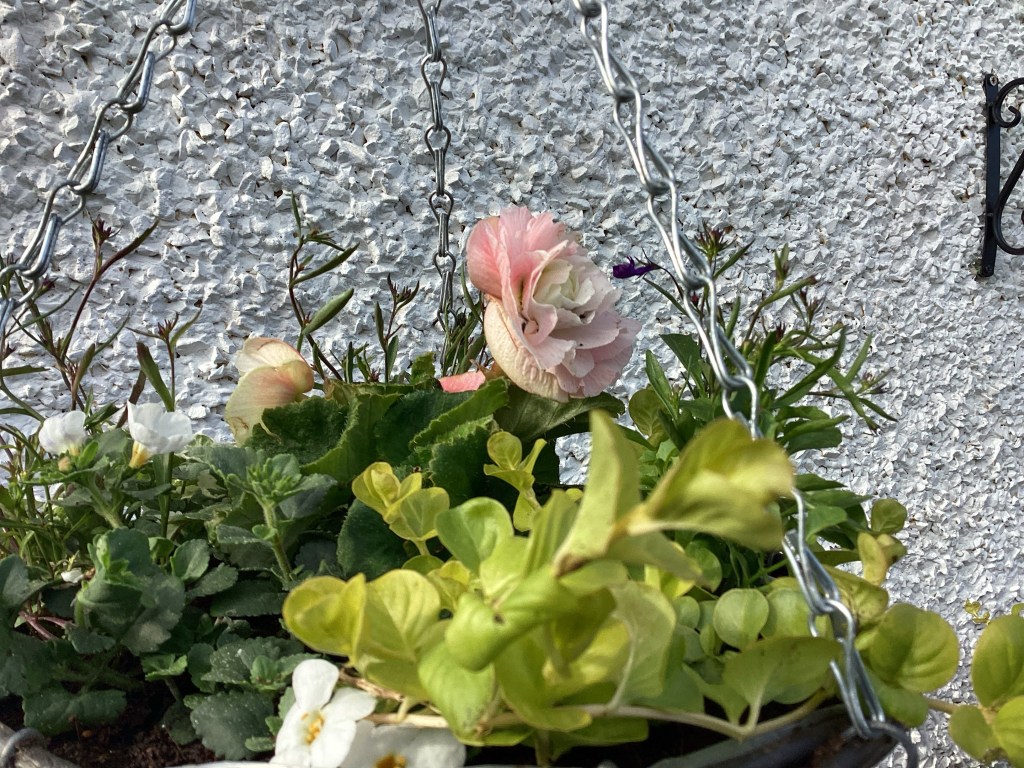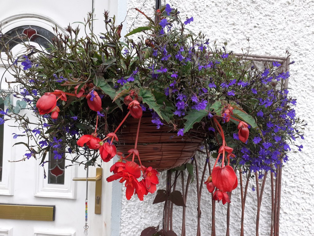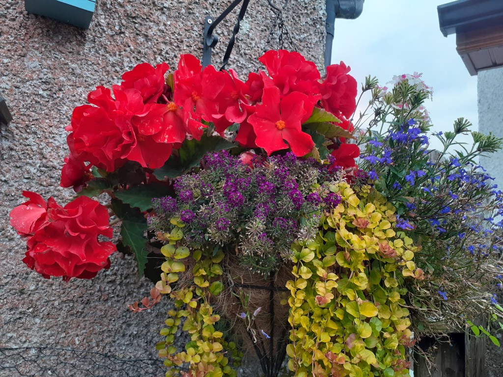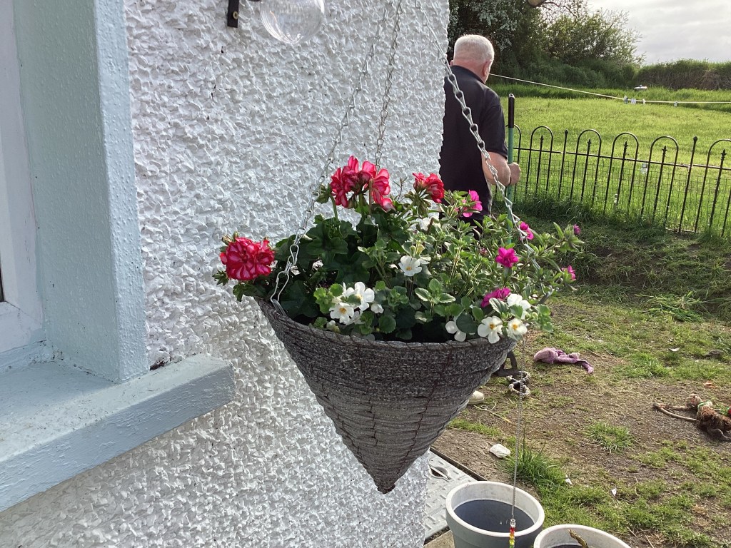 In amongst the flowers are baskets of cherry tomatoes. With todays prices we are sick of the tasteless tomatoes that are being sold in the shops. I have also just added to some old baskets (you know me, I love a bit of tatty) that had a plant called creeping jenny in them from last year. It is a vivid green, and later in the season it will be covered in little yellow flowers. I was amazed that it lasted through all that freezing weather. It just stayed put rode it out, knowing that spring would come. A plant of resilience and hope. I have simply added some blue lobelia to it, the contrast will be beautiful and it makes the whole thing very cheap but effective. I have added more to my new baskets, so I can economise again next year.
