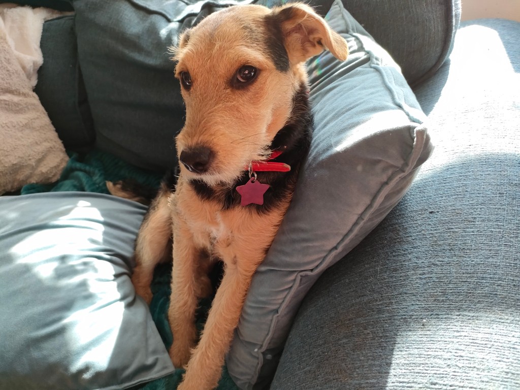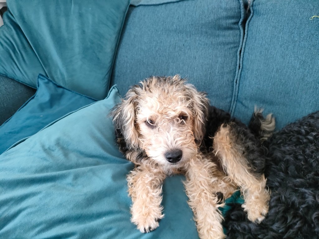 We now have all the puppies sleeping with us. Elfie gets too hot, so she climbs down onto her pillow on the floor more often than not, and then promptly snores. Luna sleeps between us and Pixie lays in the crook of my knees. Just like Harley used to do, I am sure that he has told her to. I am so used to a dog lying in that place.