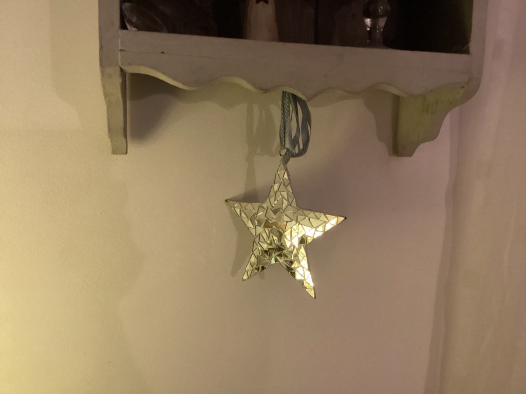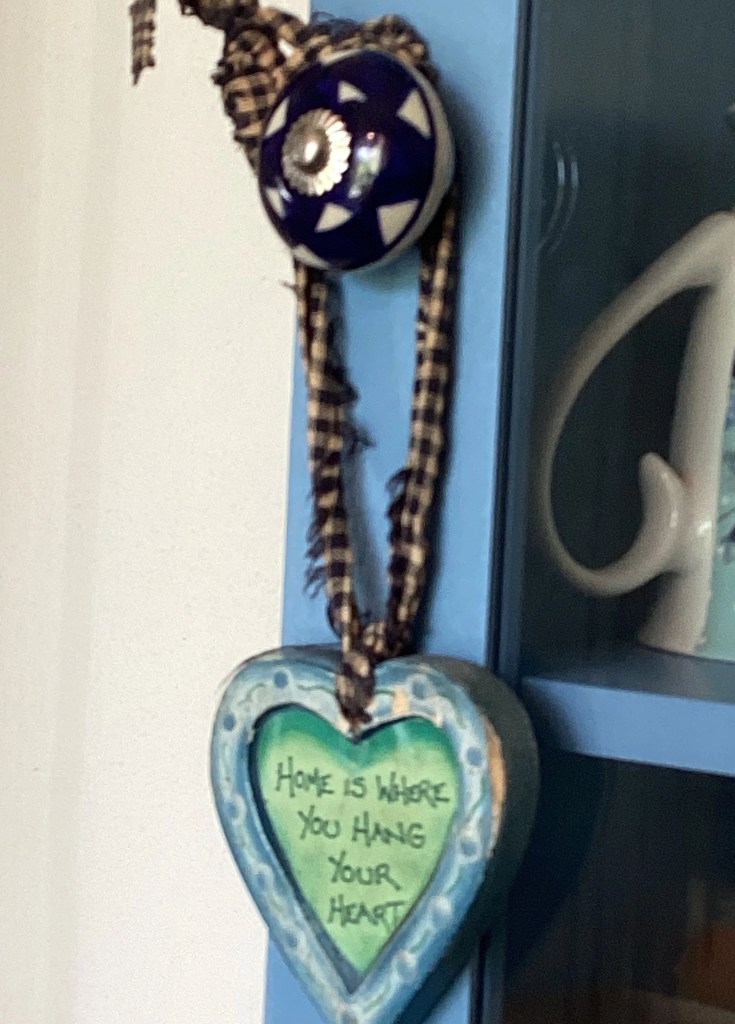 It’s the small details, like changing the handles for blue and white ceramic handles, each one different. And then hanging small little nicknacks that I have accumulated over the years…a rusty key to your heart, and a handmade (by us) wooden star. A checked heart, bought by my friend Mary, a small Angel.