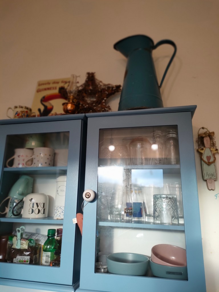 We have hung our new slimline wall cupboards, they have a clever way of lifting off the wall, so will be easy to move when we come to decorate. Although I am getting into the shabby look now. Perhaps because I have lived with it for so long!