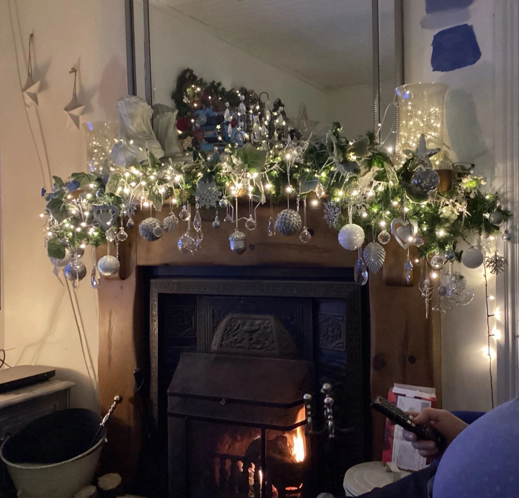 I love the arty things you can do. I have so many decorations, collected over the last thirty eight years. So I started with our Winter garland, using my Crystals, and silver and white decos. I added my icicle garland, and my snow touched ivy garland, I wanted it to look like a frozen garland. Something you would find in a magical Winter Forest.
