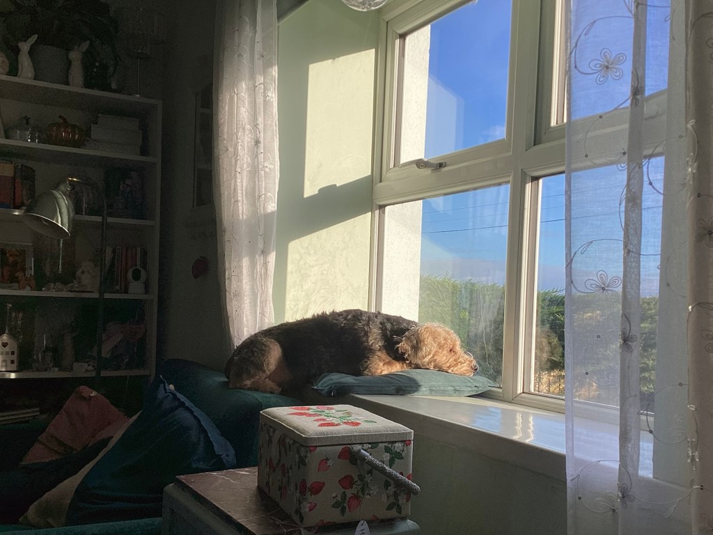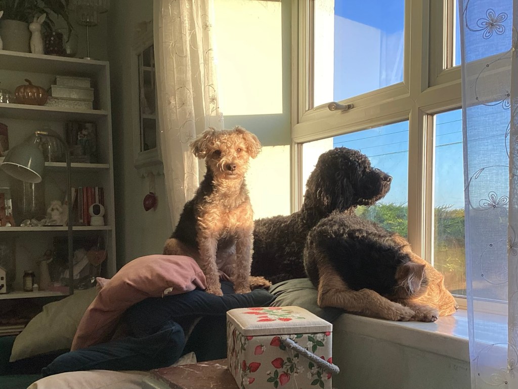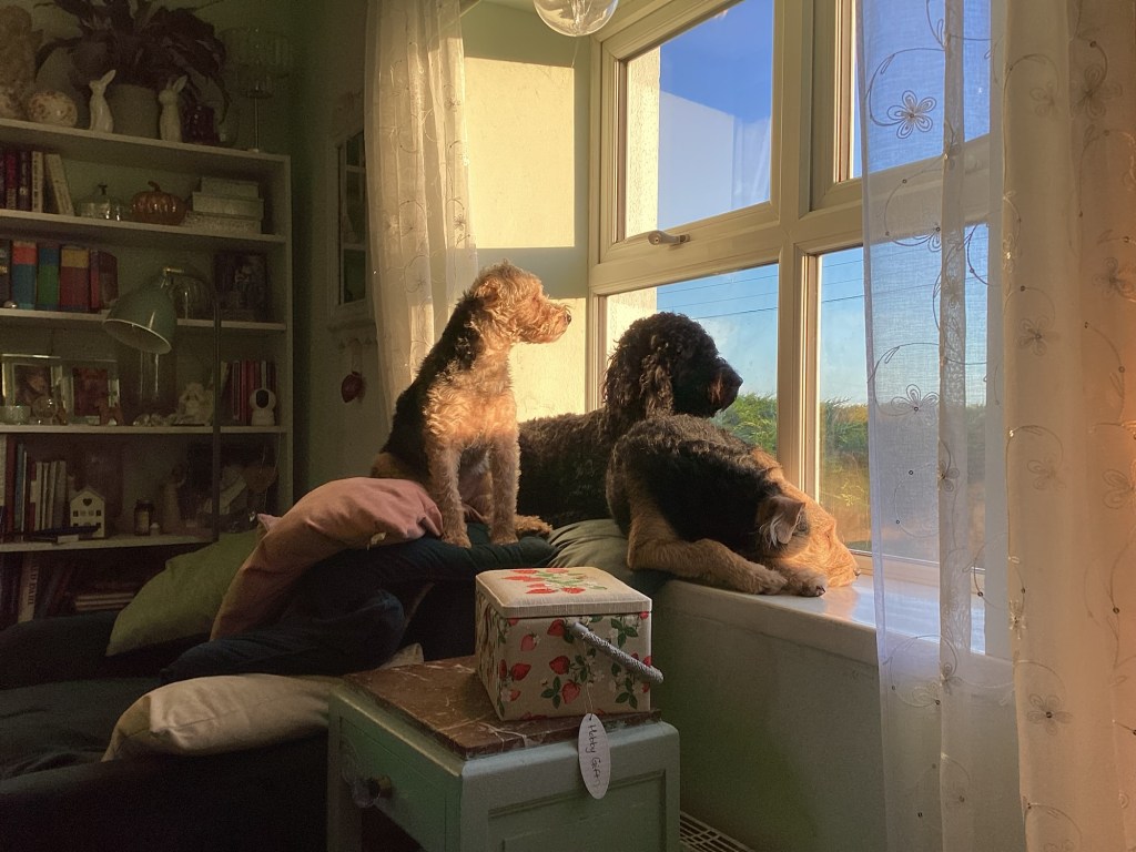 Yesterday it was a chilly day with beautiful winter sunshine. I was sitting cosied up on my sofa, counting my blessings. The girlies were all in the window together, waiting for the golden lab to go by, so they could bark at him. The sun came through and I managed to capture a moment in time, with them all together.