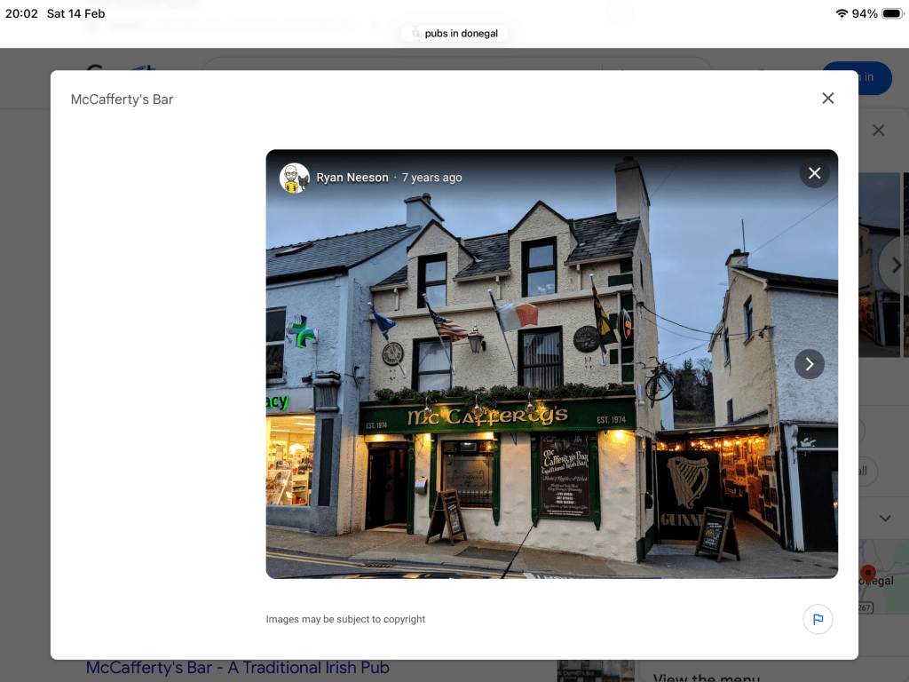 That evening we went back to the Castle Bar as it was sedate, and Donegal Town was buzzing. I decided to have a water chaser with any glass of wine, deciding I was a sedate 63 year old. Little did I know that a sedate evening was not in Life’s plan.